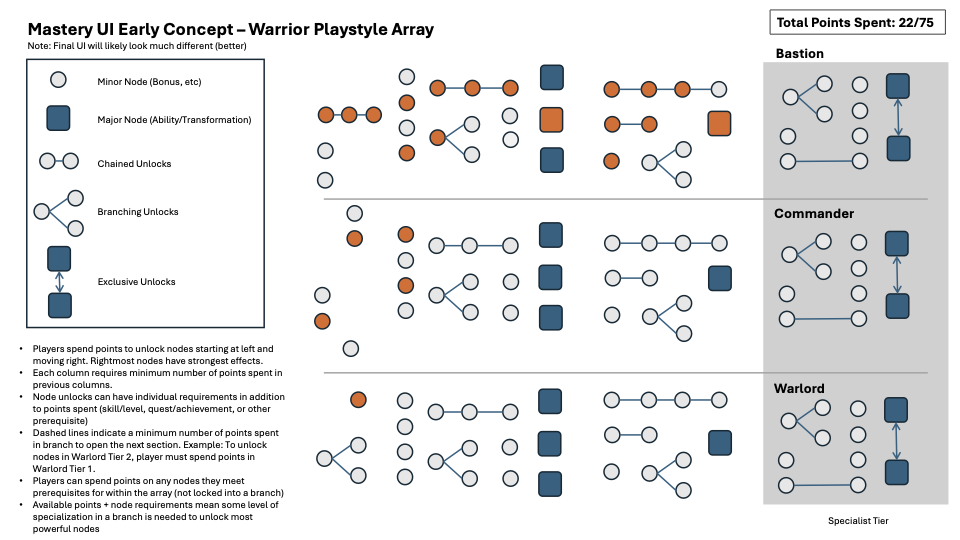 Each Mastery Array has three branches as illustrated by the concept above. As you accumulate Mastery Points, you will be able to spend them in either of the two Mastery Arrays. There will be a maximum number of points that can be spent within each array. For example, in our current concept you can spend a total of 75 points in the “thematic” array and a total of 75 points in the “tools” array. These point totals not yet final.