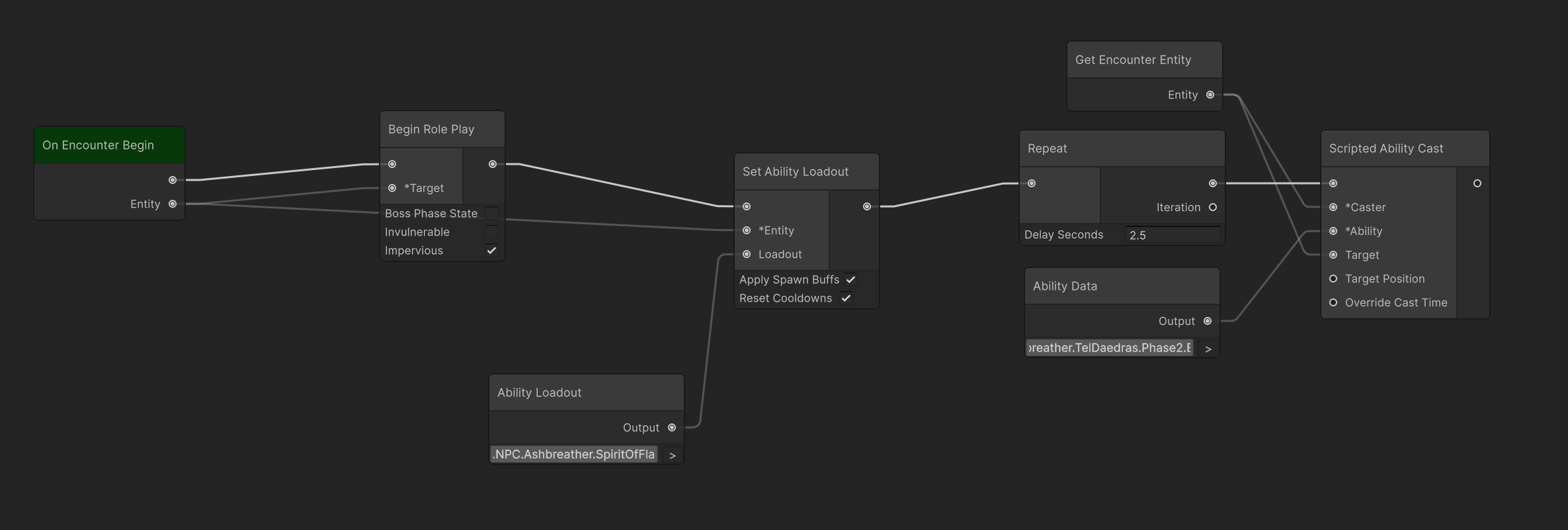 Once we’ve got the flow of the fight, the theme, and the special moves figured out, it’s time to start building everything. This is the part that can take the longest. Not only do we have to create the abilities the boss will use (and potentially animations and visual effects for those), but we also have to set up targeting conditions and cooldowns for those abilities. For example, do we want the boss to use it on the person with the highest threat, attack the healer with it, or to target someone randomly in the group they are fighting? Do we want them to use it every 15 seconds during the fight, or only at certain times? Do we want them to use the ability as soon as the fight starts or wait a bit before they start using it?